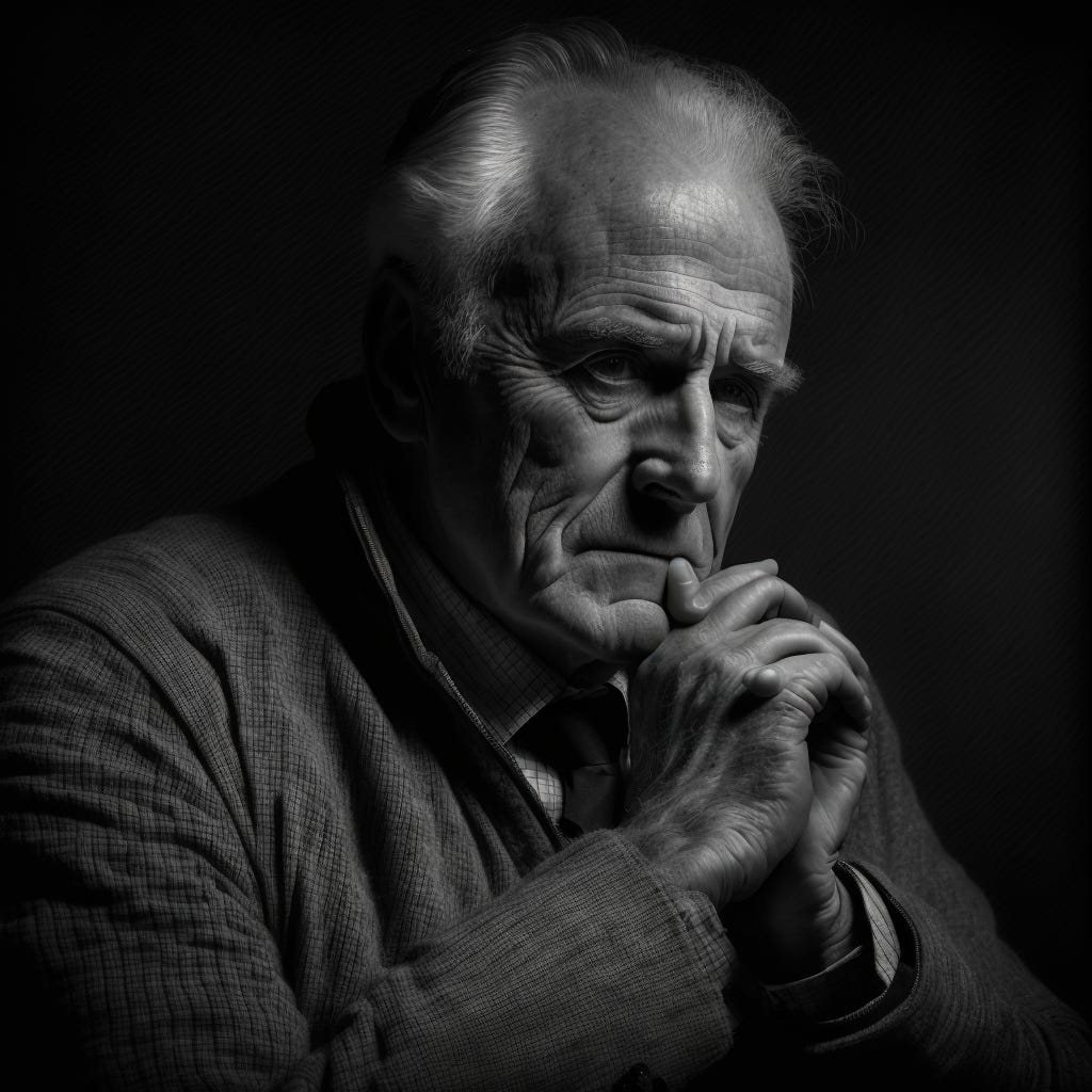 Finally, I was ready for the experiment I’d had in mind since signing on to Midjourney. I typed the prompt: “Black and white portrait of older British writer in a tweed jacket and tie in window light, hands by his face in the style of Rick McGinnis.” I didn’t anticipate that the AI had developed any sense of me or whatever might be my photographic style, and after seeing what it had delivered when I’d pointed in the direction of much more famous photographers, I didn’t imagine that it would now.