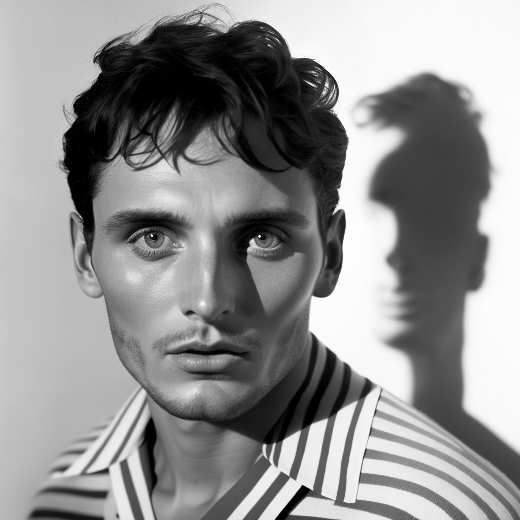 I’d read that AI software could be addictive, and I was feeling a growing flush of excitement when I composed my next prompt: “Black and white photo of young Terence Stamp wearing a striped shirt against a white seamless background in the style of David Bailey.” I wanted to see what it would do when directed to create a portrait of a real person, and I made sure this time to say “photo” instead of “portrait.”