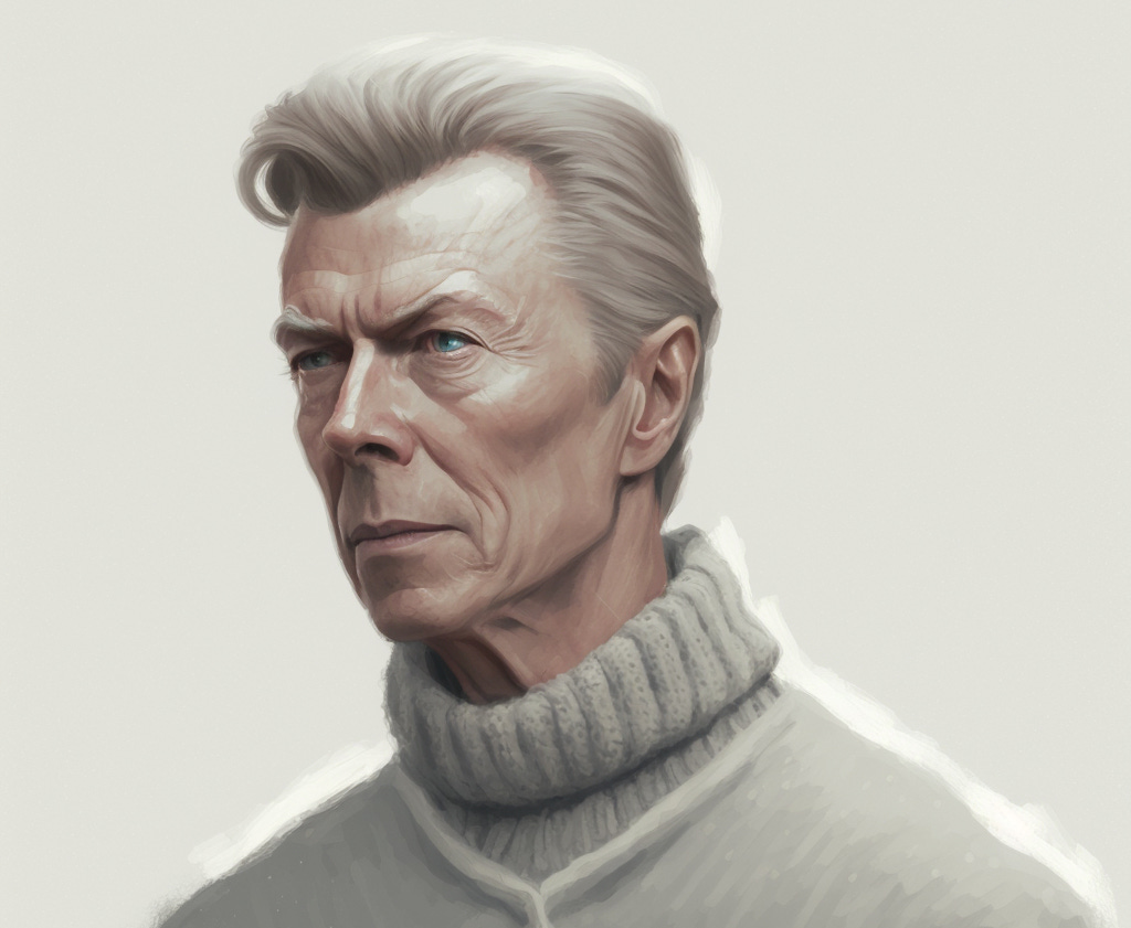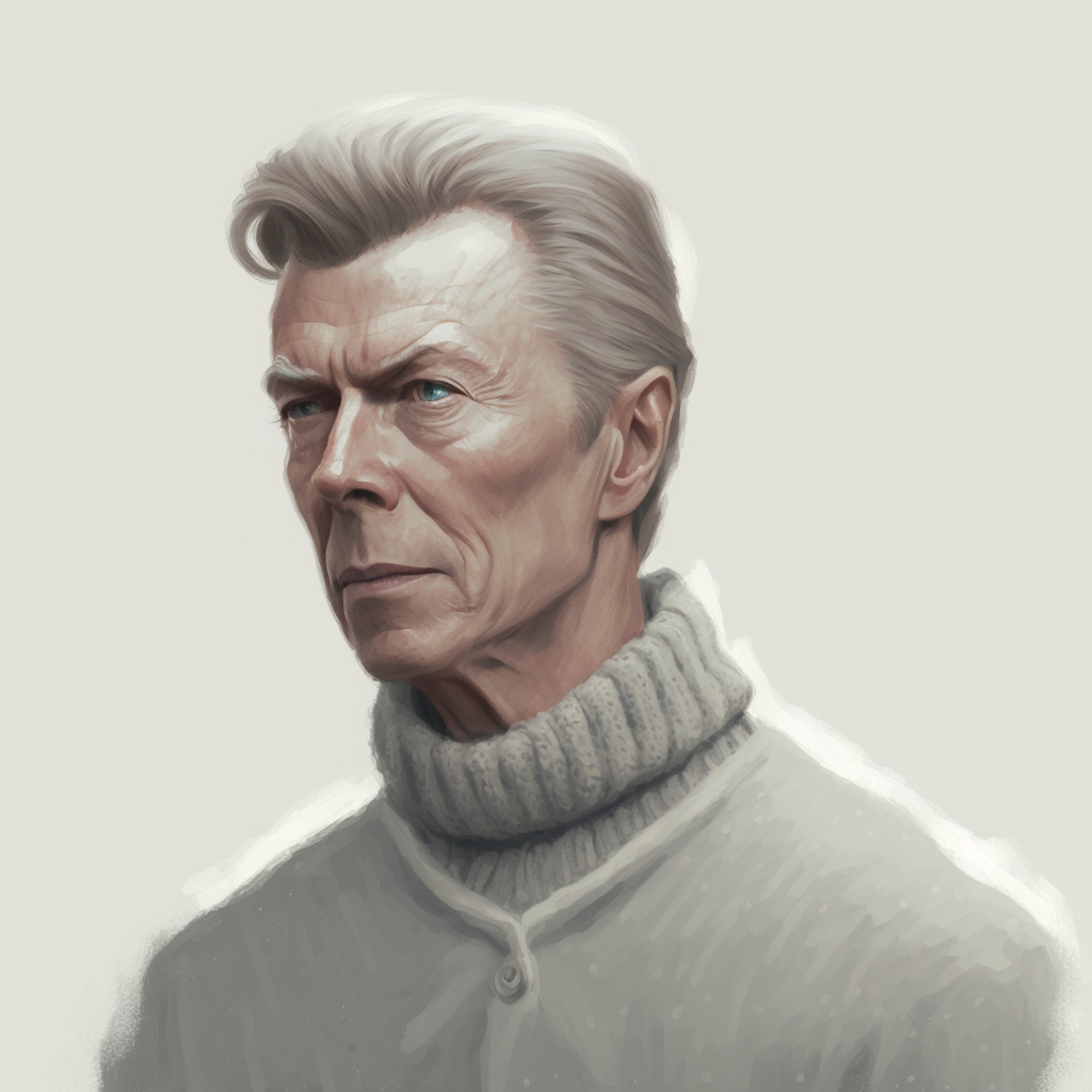 There are obviously enough photos of Bowie out there for an AI to render a decent portrait. (I can’t help but imagine that Bowie would have found this whole AI moment fascinating and inspiring; it’s the sort of cultural mutation that would have led to a whole new creative period.) The AI definitely delivered a satisfactory likeness, suitably aged, and in the kind of stark lighting scheme that I’ve favoured in my own recent work, though I doubt that any of those photos had a part in generating what is ultimately a very simple portrait.