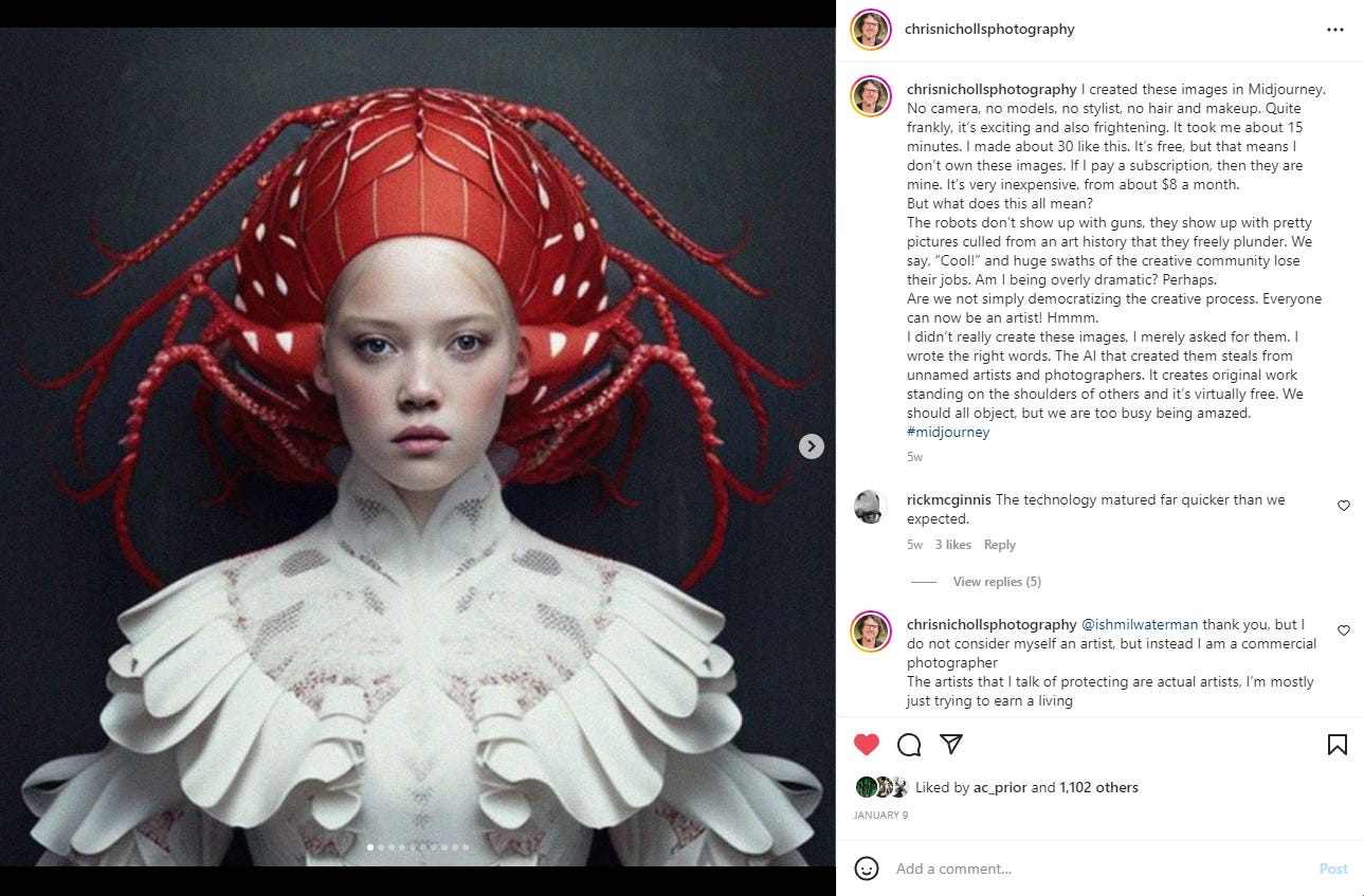 The results were so impressive that people – writers, artists and photographers, many in my circle – began playing around with the software and posting results. On Instagram, accounts began popping up in my feed devoted to AI-generated imagery, but I really noticed when a colleague of mine here in Toronto, photographer Chris Nicholls, posted a set of images on his IG feed, the results of a session in Midjourney.