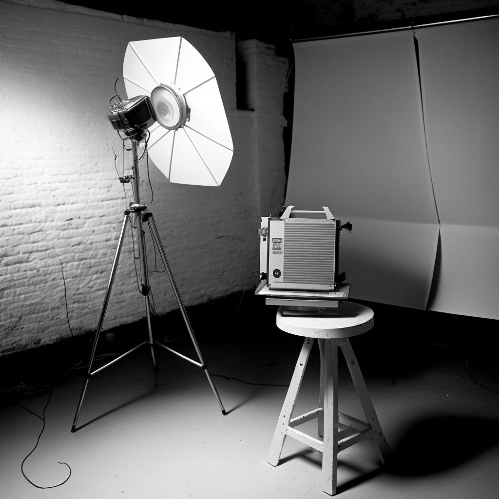I changed my approach for my next prompt, writing: “Photo of a London photo studio in the 1960s lit by a skylight with a camera on a tripod, a stool, a light in an umbrella reflector and a white seamless backdrop in the background in black and white.” I wanted to see if the AI could imagine the space my London photographer would have called his home and office. Once again, the results were baffling.