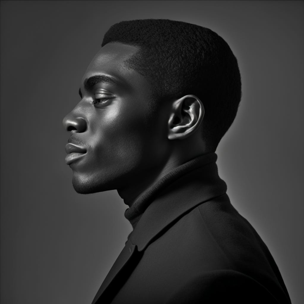 I typed the prompt “Black and white portrait of a black British musician in London in the mid Sixties in flat light in front of a grey backdrop in profile.” The result was much better. The software had picked up on the appropriate fashions and hairstyle, and had conjured up a face that I could imagine on a record sleeve. This could have been someone who played with The Equals or The Rudies.