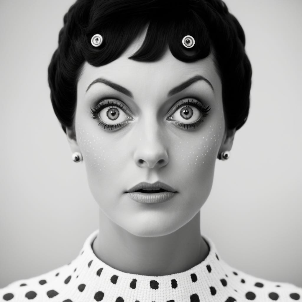 What I got…wasn’t that. The big eyes – a common trait that linked most of the top models working in London in the mid to late Sixties – were certainly there, and the hair and the clothes didn’t look jarring. But there were those white “freckles”, which appeared in all four of the options Midjourney delivered after my prompts, of which the AI was obviously quite fond.