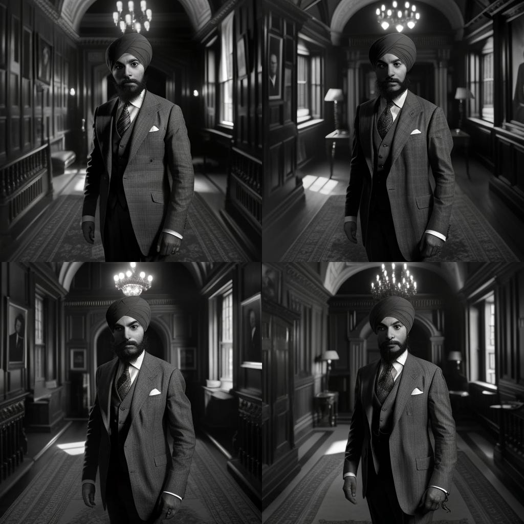 I made one more quick prompt before leaving Harold Wilson’s London, a “Photo of a British Sikh politician in a pinstripe suit in the hallway of the House of Commons in the style of Brian Duffy.” My alternate history had grown to include a Labour member in his first term, the son of a cinema owner who would hold on to his seat through the turbulent ‘70s before losing it in Thatcher’s Tory landslide, becoming chairman of ITV in the ‘80s and a peer in the ‘90s: Lord Singh of Ealing, predecessor to Baron Suri.